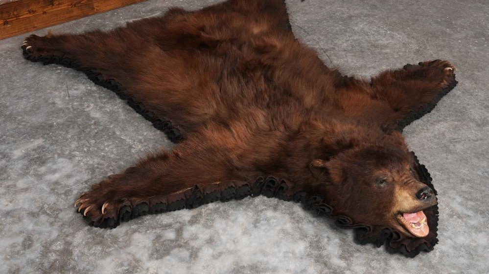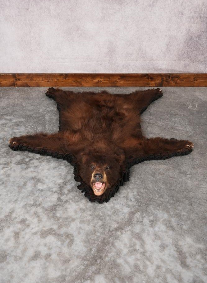 A rare “Deep Cocoa” Black Bear rug featuring a rich, chocolate-brown winter coat. Professionally shaped with a lifelike head mount, double-layered earth-toned felt borders, and a reinforced canvas backing for a high-end finish.